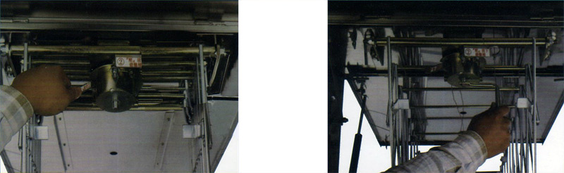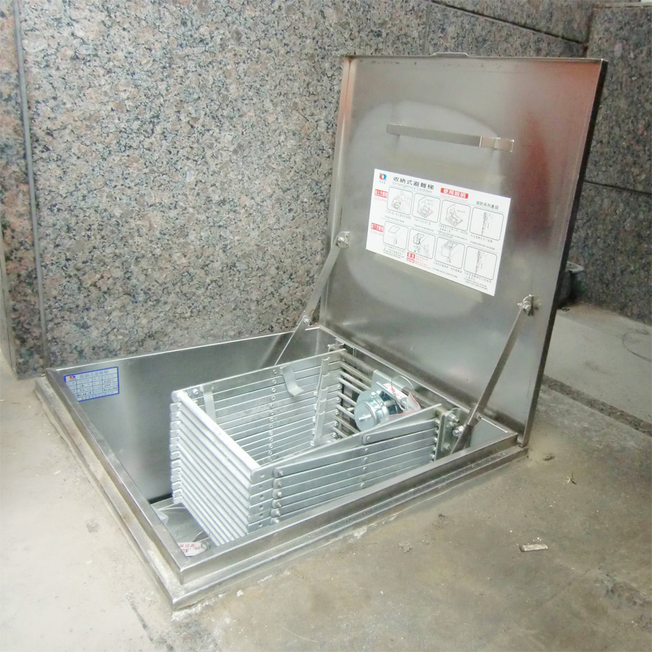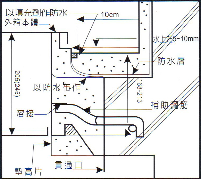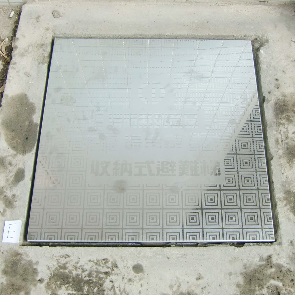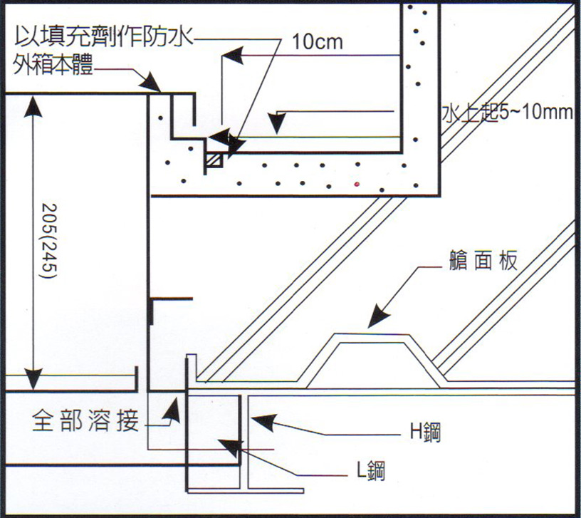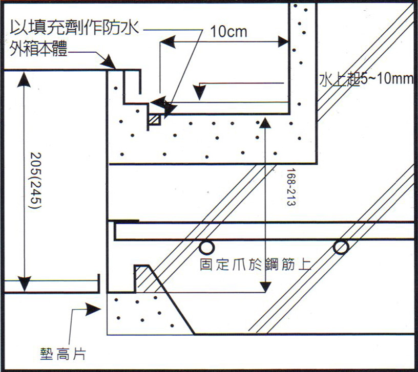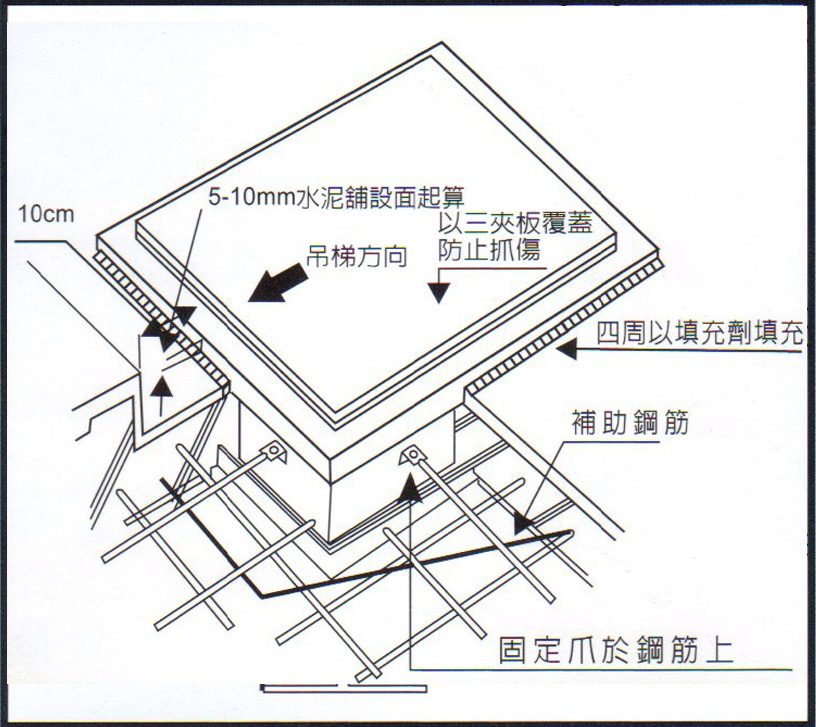 安裝方法: (一)鋼筋水泥工程上裝置避難梯(如圖一) ●打水泥同時裝設之方法: 1.在水泥模板上,離開防火對象物最少10公分的位置上(間隔太小時易發生上蓋開啟不良)以外箱本體之固定爪焊接在鋼筋上做固定。(鋼筋不夠長時,加補強剛再焊接) 2.配合水泥版面的厚度,在外箱本體之底部放置墊片調整能適應水泥版面之高度(最後的水泥粉刷面應調整至能確保外箱本體框之邊緣5~10mm程度) 3.灌漿後施以防水水泥,並在外箱本體四周以填充劑填充。水泥粉刷面有水上的一邊與水下的一邊,應在水上的一側按b之記述維持應有的間隔。(此種處理為避免外箱蓋之絞鏈浸於水泥面發生打不開之情形) ●後裝法(如圖二) 1.開比外箱本體框稍大之貫通孔(焊槍能伸出之程度)再灌漿,解開模板後以外箱側面之固定爪焊接在鋼筋上(鋼筋不夠長時,加補強剛再焊接) 2.在貫通孔與外箱本體之間隙灌防水水泥後再以填充劑填充外箱本體四周。以防水布做防水時,應從外箱本體之上框的側面放入內側,並將其拉高至本體之側面。水泥粉刷面應調整至能與外箱本體確保5~10mm程度。 (二)於鋼骨工程時裝設避難梯之方法(如圖三) 1. 於艙面上開一個比外箱本體下框稍大之開口。 2. 在外箱兩側的H型鋼樑上順著艙面板的開口加上H-100X50程度的小樑,再以L-75x75x6左右的角鋼配合開口,放在小樑上。 3. 將外箱本體焊接在上開鋼筋與艙面板上固定,灌漿後再施以防水水泥,並在本體四周以填充劑填充。水泥粉刷面應調整至能與外箱本體確保5~10mm程度。 (三)同時施工示意圖(如圖四) (四)安裝完成範例(如下圖)