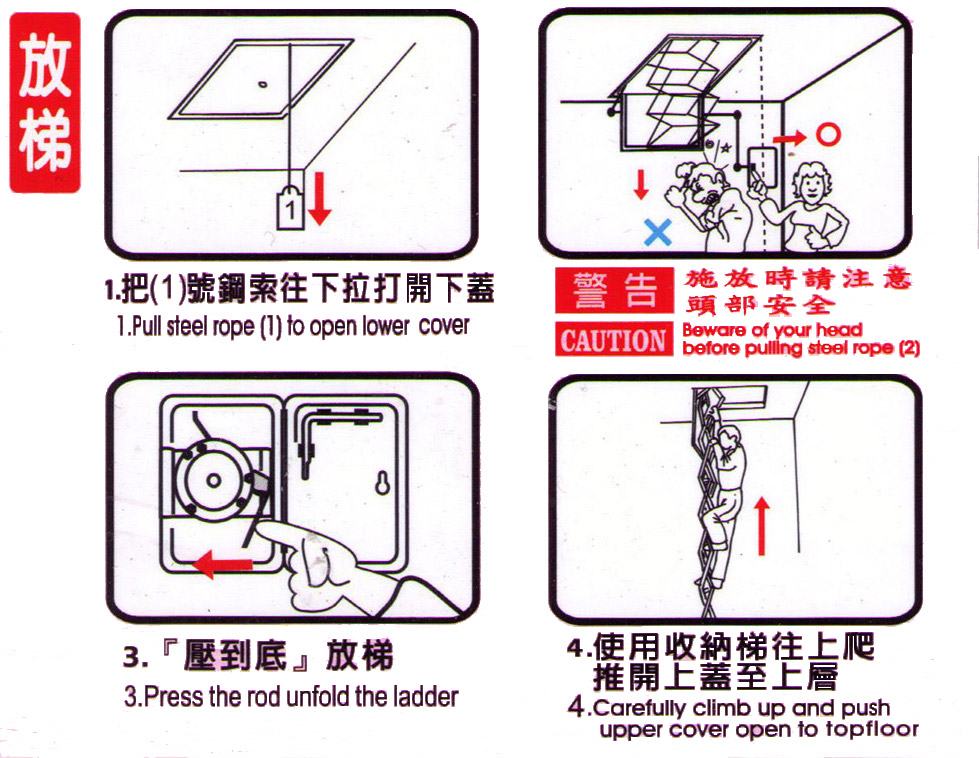 安裝地點的選擇: 1.設置地點的選擇,需注意能確保上、下兩方向避難之順暢為原則,並且設置位置顯著。 2.開口位置應面向寬度1公尺以上的通道或空地為宜。
